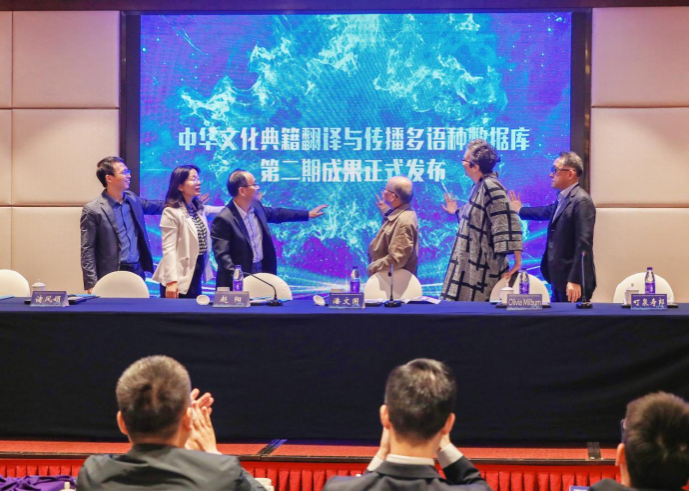 随后,校长赵阳、人文社会科学处处长诸凤娟、外国语学院院长胡朋志、潘文国教授、Olivia Milburn 教授、町泉寿郎教授共同启动了“中华文化典籍翻译与传播多语种数据库”第二期建设成果发布工作。