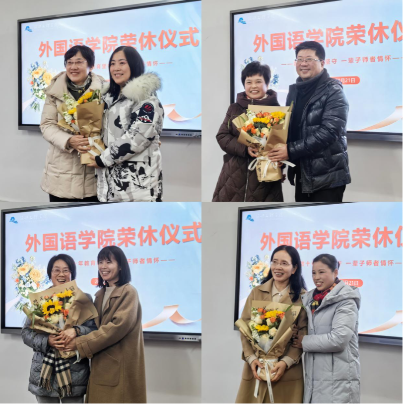 1月21日下午,外国语学院2025年度教职工荣休仪式温情启幕,向深耕教坛、默默奉献的钟莉莉、冯燕、袁秀凤、吕飞飞四位资深教师致以崇高敬意与诚挚祝福。学院党政班子成员、教师代表参加活动,活动由院长胡朋志主持。